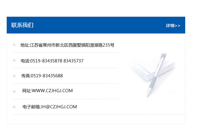 地址:常州市新北區友邦商務大廈1幢16、17層  電話:0519-85101652  傳真:0519-85112595  郵編:213022  網址:www_cz-jiayue_cn.lbldcaohai.com  郵箱:xiajifengaa@163.com